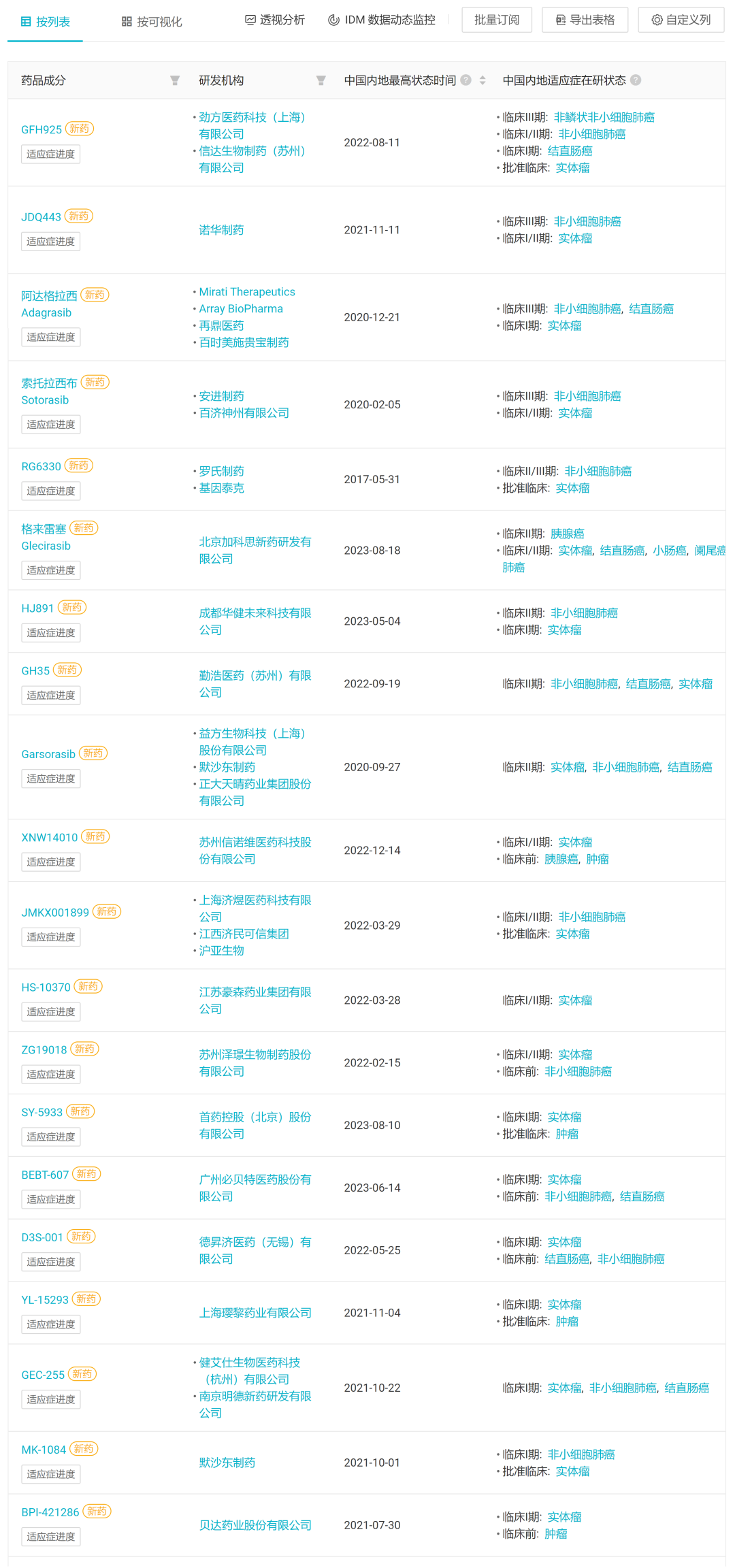 据 Insight 数据库显示,排除非积极项目,中国企业参与的 PD-1 单抗项目有 52 个,靶向 EGFR-T790M 的化药有 45 个,而 KRAS G12C 靶点的化药,则有 53 个之多。虽然把进度限定在临床阶段,项目数将被缩减到 37、30 和 21 个, 但 KRAS G12C 靶点的激烈程度仍不容小觑。