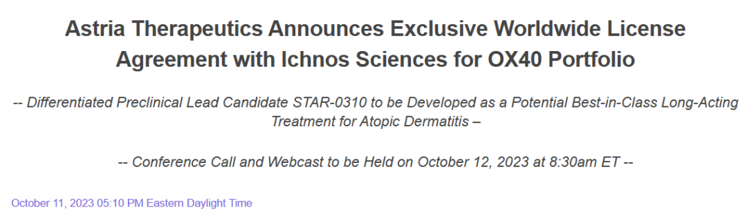 10月12日,Astria Therapeutics宣布已与Ichnos Sciences签订了一项全球独家许可协议,将开发OX40产品组合,用于治疗特应性皮炎(AD)和其他过敏性和免疫性疾病。Astria计划开发一种名为STAR-0310的主要候选药物,这是一种结合YTE半衰期延长技术的单克隆抗体OX40拮抗剂,用于治疗AD,以及良好区分的安全性和耐受性。OX40抑制是一种临床验证的AD治疗机制。Astria也看到了STAR-0310潜在扩展到其他适应症的机会。