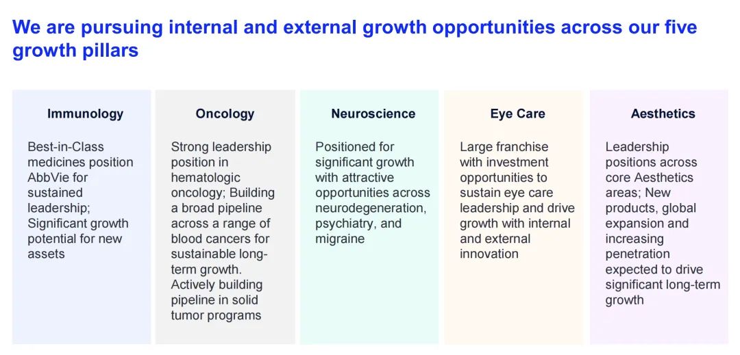 Wendy:在S&E,我负责亚太及日本地区制药业务,Danni负责该地区医美方面的业务。以下是艾伯维重点关注的五个支柱性领域:
