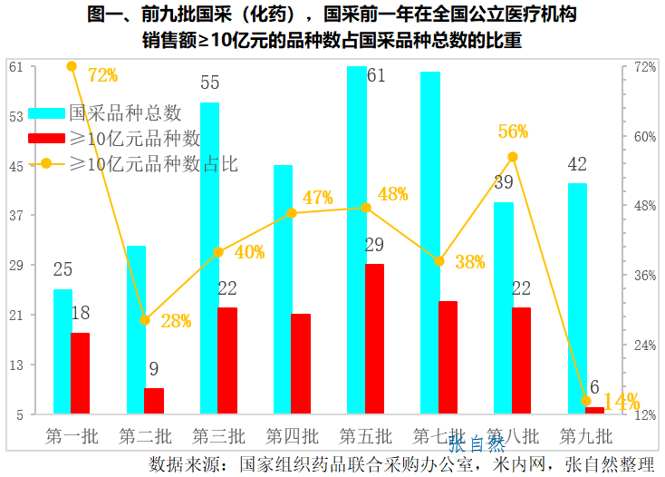 前九批国采共覆盖359个化药,市场规模超4700亿,其中,国采前一年在全国公立医疗机构销售额超过10亿元的品种有150个(占42%),市场规模超4000亿(占八成),即42%的10+亿品种贡献了八成的国采市场规模。