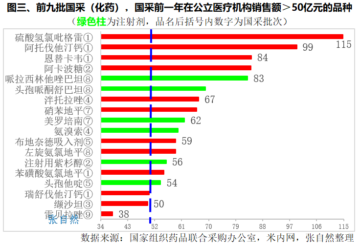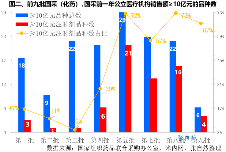 纵观前九批国采,第五批涉及的10+亿大品种数最多,有29个,因第五批是注射剂一致性评价规则发布后的首次国采,注射剂大品种得以集中亮相。