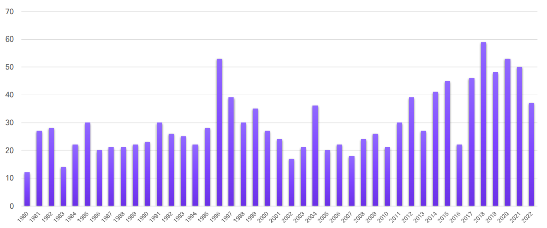 “技术为王、创新为本”已成为全球制药行业的共同追求与发展宗旨。数据显示,1980-2022年期间,FDA每年批准至少10款新药上市,2018年批准数量达到峰值59种,创下迄今为止新药获批上市的最高纪录,此外可明显看到2017-2022年间,FDA一直保持高速批准新药的态势,每年都获批40+新药上市。