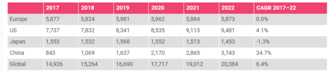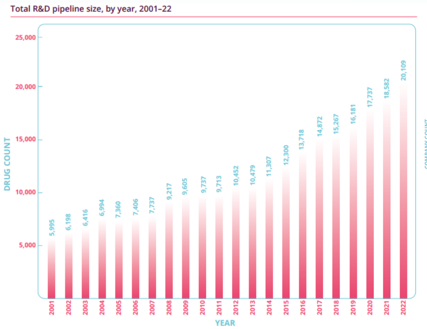 图.全球药物研发管线数量(2001-2022)来源:Pharmaprojects