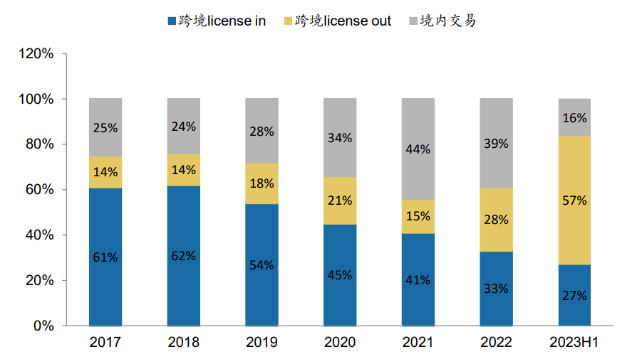 从2017-2023H1中国医药交易数据中可看出,跨境license in交易热度明显下降,占比由2017年61%减少至2023年H1的27%,相反license out占比屡创新高,2023H1跨境license out占药企交易数据比例超50%。一定程度上表明国内药企越来越注重自主研发能力的提高,研发成果也受到更多MNC药企的青睐,国内制药工业创新国际化在持续发力。从license out交易的标的看,药物类型更加丰富,除了创新靶点的小分子,还有双抗、ADC、CART多种创新类型,产品所处阶段多为II期及以前,不乏有临床前产品出海,体现我国药企早期研发能力受到国际药企的认可。