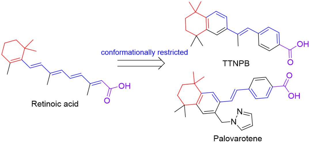 没找到palovarotene的药物发现文章。但笔者发现pan-RAR激动剂TTNPB和palovarotene结构相似,都是视黄酸的conformationally restricted类似物。palovarotene应该是在TTNPB的结构基础上优化RAR-γ选择性得到的[5]。