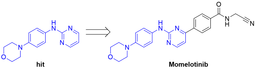 针对分离的JAK2酶和JAK2依赖性工程细胞系(Baf3TEL-JAK2)筛选Cytopia的内部激酶化合物库,鉴定出几个亚微摩尔的N -(4-吗啉代苯基)-4-芳基嘧啶-2-胺类hit。虽然有对接结构,但根据文章的优化思路,并没有涉及太多SBDD的内容,更多是根据药化经验进行SAR。研究人员对嘧啶的取代基进行SAR优化活性和口服利用度得到Momelotinib[6]。