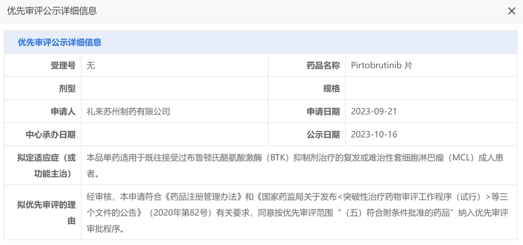 这是 Pirtobrutinib 首次在国内申报上市。