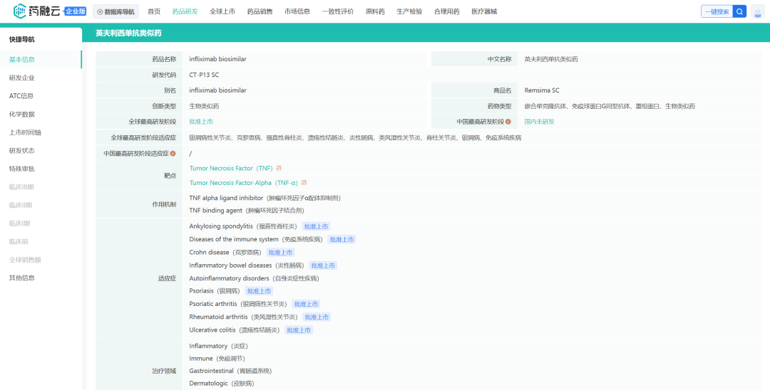 Remsima是世界上第一个获得欧洲药品管理局(EMA)批准的生物类似药单克隆抗体。是一种抗肿瘤坏死因子,用于减少炎症和改善其指征疾病的其他症状。适用于治疗成人和儿童克罗恩病(CD)、成人和儿童溃疡性结肠炎、类风湿性关节炎、强直性脊柱炎、牛皮癣和银屑病关节炎。