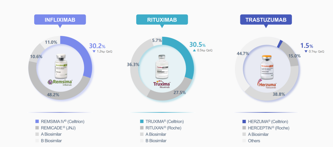 Celltrion推出的生物类似药(Biosimilar)主要有:贝伐珠单抗(Vegzelma)、阿达木单抗(Yuflyma)、瑞丹维单抗(Regkirona)(COVID-19领域)、英夫利昔单抗(Remsima)、利妥昔单抗(Truxima)和曲妥珠单抗(Herzuma)。