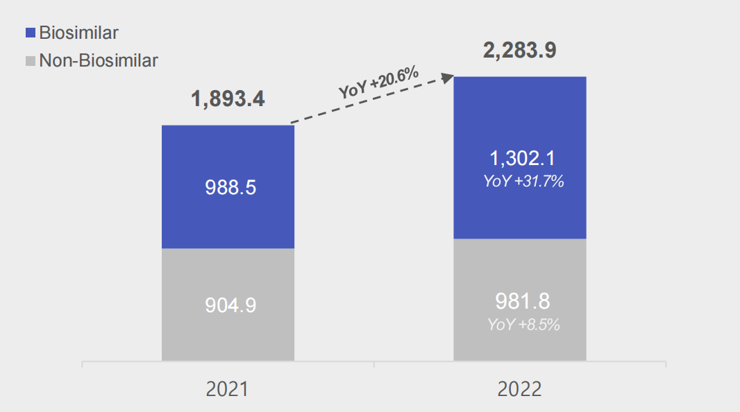 2022年Celltrion总销售额为22839亿韩元(17.02亿美元),与上年同期相比增长20.6%。其中,生物类似药销售额同比增长31.7%,非生物类似药销售额同比增长8.5%。生物类似药的强劲势头得益于Remsima IV美国市场份额的大幅增长和新推出的产品;在非生物类似药领域,尽管与COVID-19相关的销售额有所萎缩,但小分子业务销售额增长了32.2%。