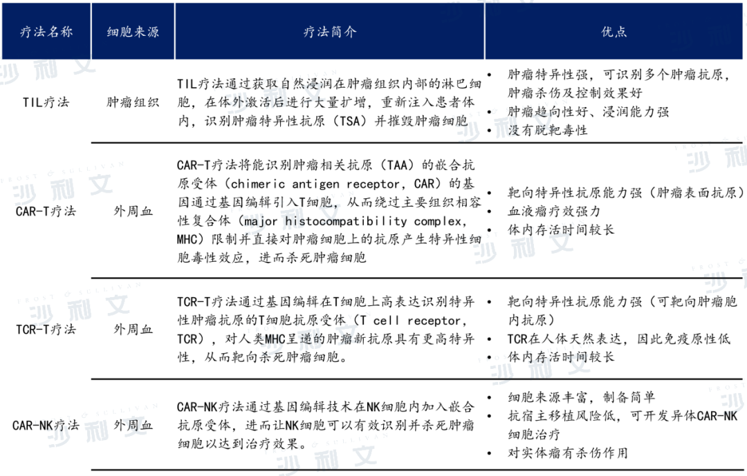 图三 主要细胞免疫治疗细胞来源、应用领域以及治疗优势