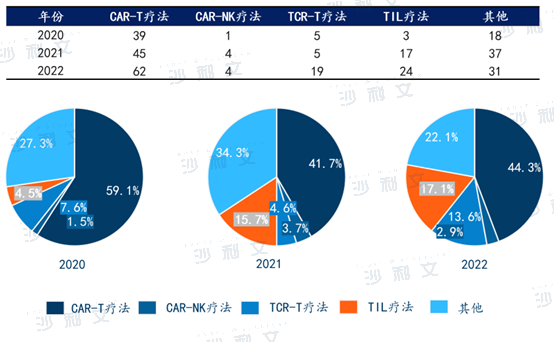 图五 2020年至2022年实体瘤不同细胞免疫治疗临床试验数量及占比变化