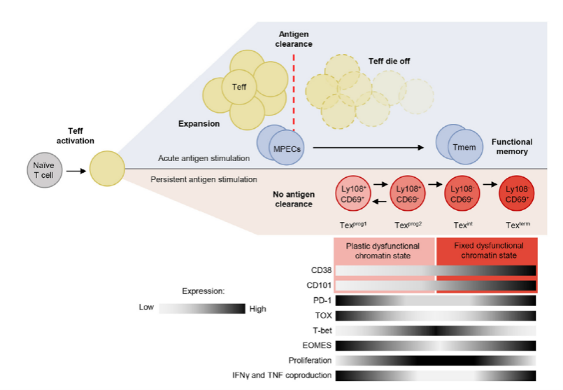 当T细胞长期处于抗原刺激但是无法消除抗原时,会导致T细胞进入到耗竭状态