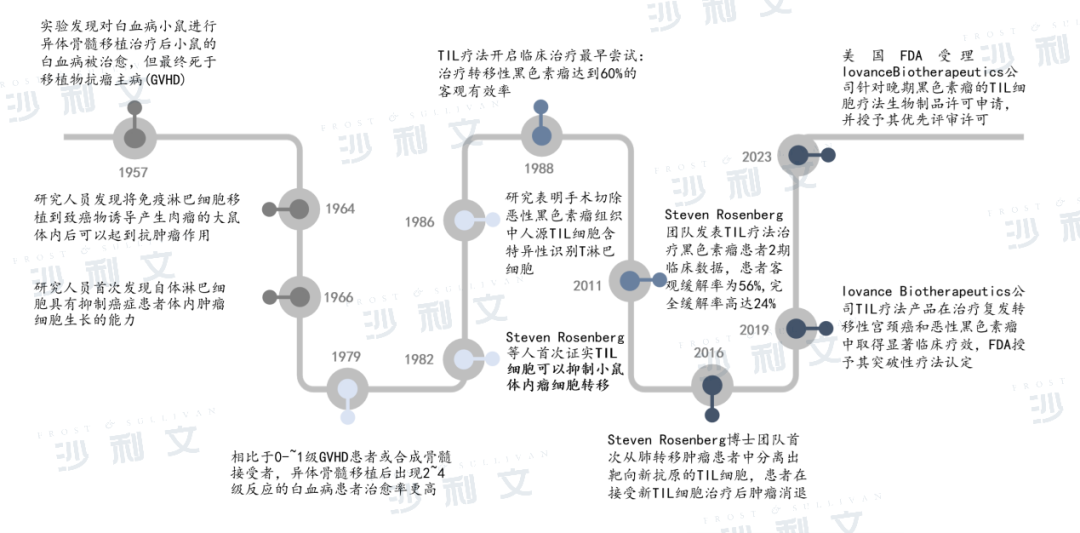 20世纪50年代TIL疗法先驱Steven Rosenberg博士便已经开始探索移植物抗肿瘤反应以及T淋巴细胞(T lymphocyte)在抗肿瘤中的应用,于1982年和来自美国国立卫生研究院(National Institutes of Health,NIH)的同事首次从小鼠模型中分离出TIL细胞,并证明了TIL在小鼠肿瘤模型中显著的治疗效果,又于1988年首次报道了TIL疗法在黑色素瘤病人中的临床试验。此后经历数十年,TIL疗法的治疗效果逐渐得到认可并被认为是治疗实体瘤的一种有效手段。