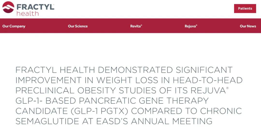 日前,美国生物技术公司Fractyl Health在欧洲糖尿病研究学会(EASD)年会口头报告发布了在研产品的临床前实验情况,其Rejuva基因治疗平台基于GLP-1的胰腺基因治疗候选药物GLP-1 PGTx,在与司美格鲁肽的临床前高脂饮食诱导肥胖(DIO)啮齿类动物模型的“头对头”实验数据表现优异。