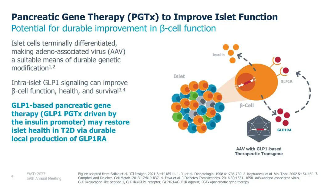 当前,胰腺基因治疗(PGTx)还处于早期开发阶段,没有被任何监管机构批准用于研究或商业用途。据悉,GLP-1 PGTx的工作原理是使用失活的腺相关病毒递送刺激胰腺细胞中GLP-1表达的基因,从而导致胰岛素释放,这项技术建立在今年6月Fractyl Health于美国基因与细胞治疗学会大会(ADA)上发表的一项猪概念验证研究的结果基础上。