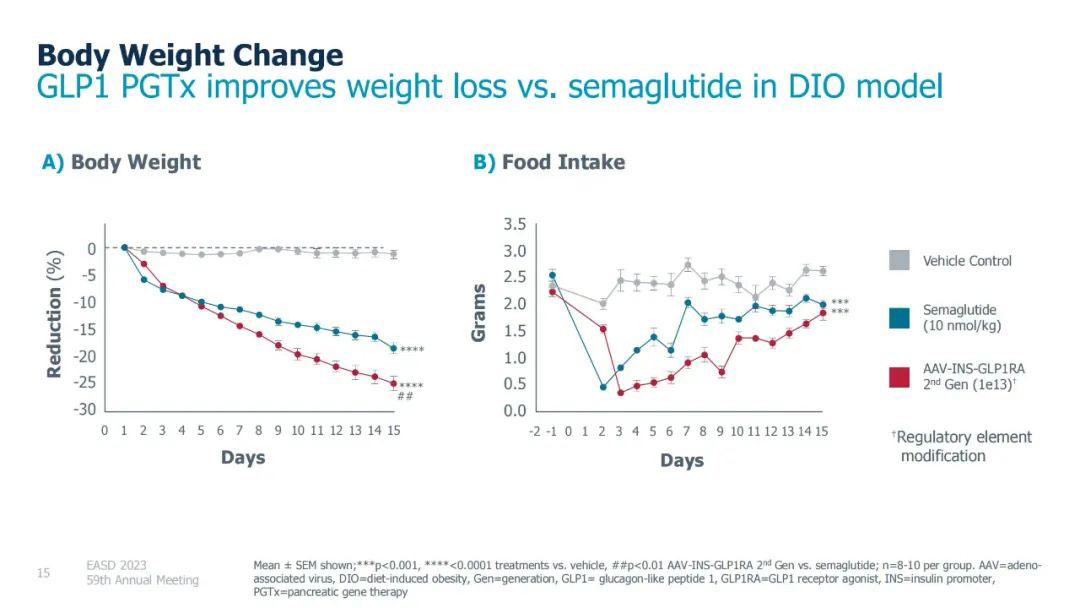 实验结果显示,单次给药由腺相关病毒(AAV)递送的GLP-1 PGTx,可让肥胖动物在第15天的总体重降低24.8%,而按10 nmol/kg/天剂量长期给药司美格鲁肽的对照组总体重仅降低18.4%(p<0.01,每组n=10)。且在该研究的第15天,基因治疗组和司美格鲁肽治疗组动物的体重都没有达到稳定状态。