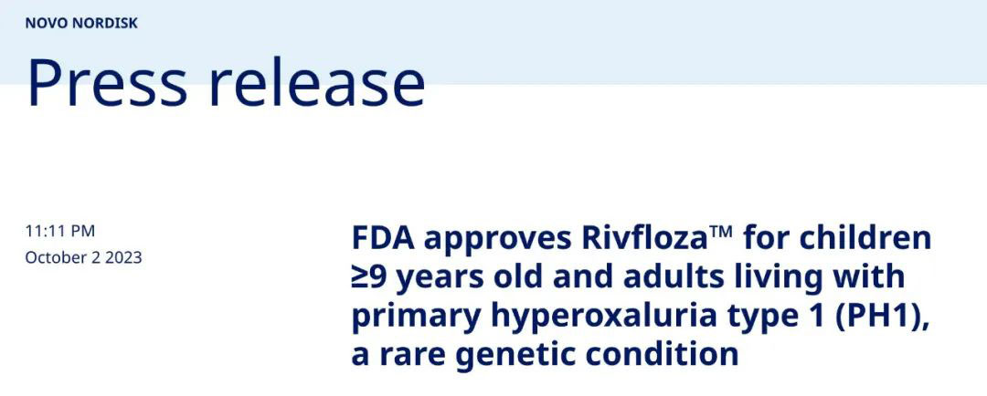 就在诺和诺德宣布自家“黄金大单品”司美格鲁肽因疗效优异,提前终止该药治疗患有2型糖尿病患者的肾脏损伤和慢性肾病的Ⅲ期临床试验前一周,美国FDA批准了RNAi疗法Rivfloza(nedosiran)注射液,用于降低9岁及以上儿童和成人1型原发性高草酸尿症(PH1)患者的尿草酸水平,这些患者的肾功能相对良好。据悉,Rivfloza是诺和诺德开发的首款获批RNAi疗法。