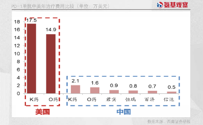 “低价”标签在PD-1领域体现的最为明显。如下图所示,PD-1在国内市场的定价,中国药企的原研药价格均不足K药、O药的50%。