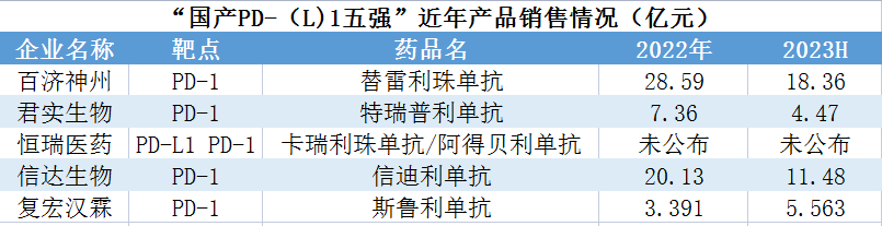 H药汉斯状(斯鲁利单抗)在2022年3月便已获批,目前获批适应症4项,是全球首个获批一线治疗小细胞肺癌的抗PD-1单抗。至2022年末上市9个月销售额就达3.391亿元。2023年上半年,汉斯状实现销售收入约5.563亿元。汉斯状年销售有望突破10亿元,同时成功跻身国产PD-1第一梯队,和上述四强选手一起,组成“国产PD-(L)1五强”。