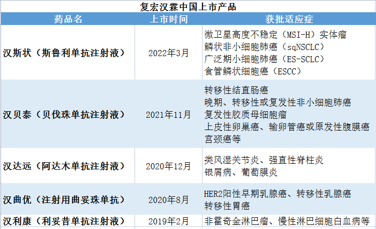 加上前文提到的H药汉斯状,以及汉利康(利妥昔单抗注射液)、汉曲优(注射用曲妥珠单抗)、汉达远(阿达木单抗注射液)、汉贝泰(贝伐珠单抗注射液),复宏汉霖在国内上市的产品共5款。
