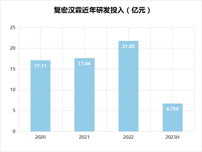 除了已商业化的产品,复宏汉霖注重研发投入,其中,2020年,复宏汉霖研发投入17.11亿元;2021年,研发投入17.64亿元;2022年,研发投入约21.83亿元,同比增加约4.20亿元。2023上半年投入约6.74亿元。