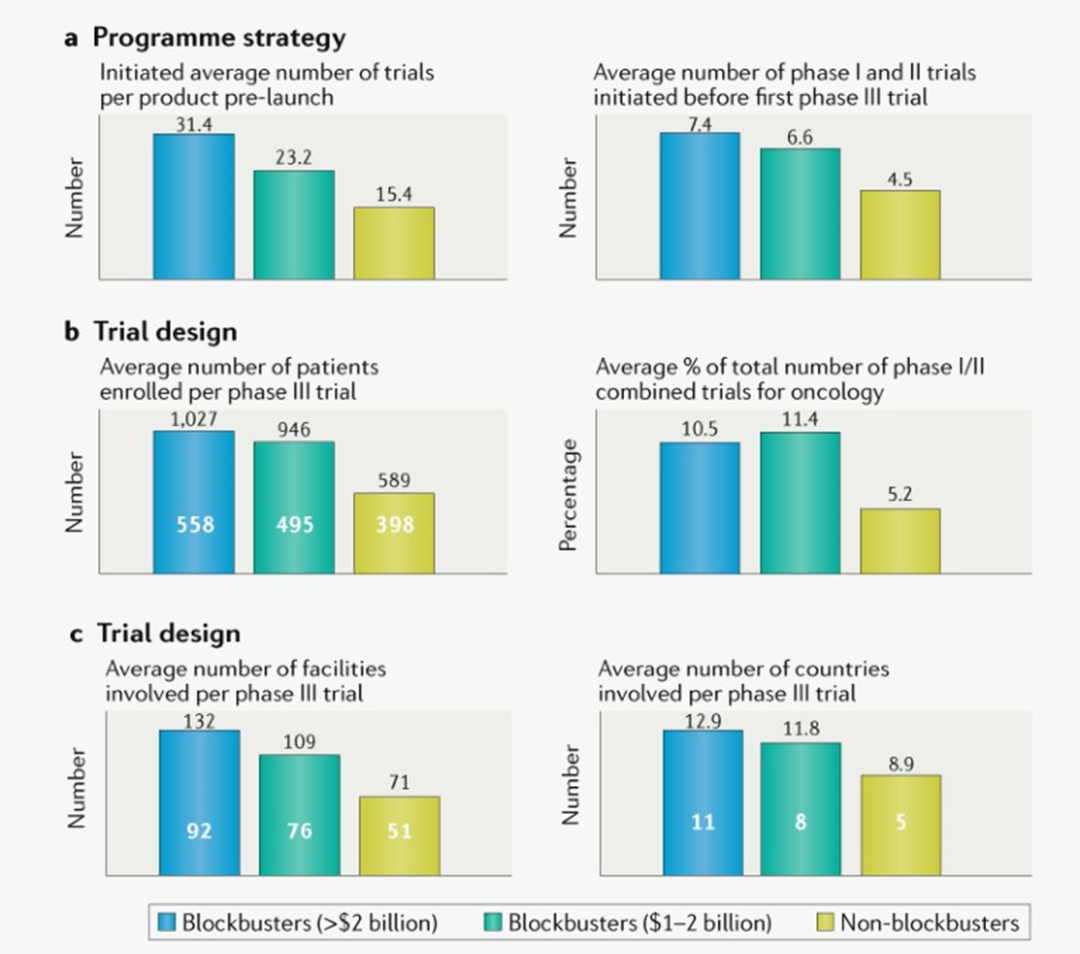 图2. 开发新的潜在重磅炸弹药物。a | 计划策略,上市前临床试验数量。b, c | 试验设计指标。白色数字为中位数,黑色数据为平均值。(图片来源:Nature Review Drug Discovery)