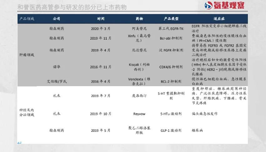 其中,多个如今的明星项目,包括阿美替尼、度洛西汀、厄达替尼、拉米替坦、聚乙二醇洛塞那肽、瑞博西尼、氟马替尼及维奈托克等已成功实现商业化。