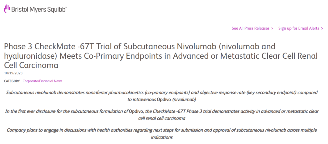 10月19日,BMS宣布纳武利尤单抗(Opdivo,nivolumab)皮下注射制剂对比其静脉注射制剂用于既往接受过全身治疗的晚期或转移性肾透明细胞癌(ccRCC)患者的III期CheckMate-67T研究达到了共同主要终点和关键次要终点。