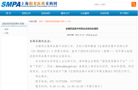 昨日,国家组织药品联合采购办公室发布全国药品集中采购企业培训会通知,确定将于10月23日(下周一)召开第九批国家组织药品集中采购企业培训会。