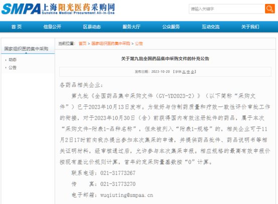 今日,国家组织药品联合采购办公室又发布关于第九批全国药品集中采购文件的补充公告,对于2023年10月30日(含)前获得国内有效注册批件的药品,属于本次“采购文件-附表1-品种名称”,但未被列入“附表1-规格”的,相关企业可于11月2日17时前向提出参加本次集采的申请。