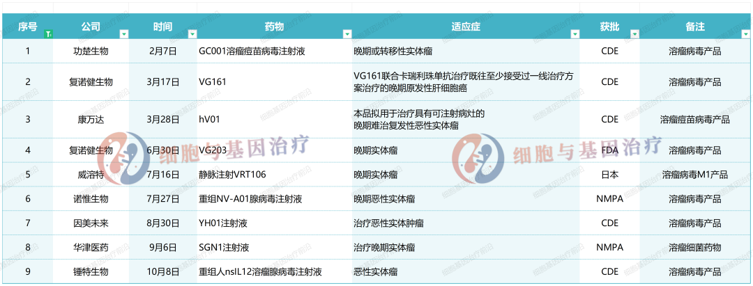 溶瘤病毒疗法(Oncolytic Virus, OV)是基于病毒在肿瘤中的感染和复制来杀死肿瘤细胞的免疫疗法,其在复制高效性、肿瘤靶向性佳、肿瘤杀伤途径多、不良反应小等多方面仍具有明显优势。近年来,溶瘤病毒疗法已经成为肿瘤治疗研究领域的新热点。据整理,今年以来,已有9款溶瘤病毒产品IND获批。如下: