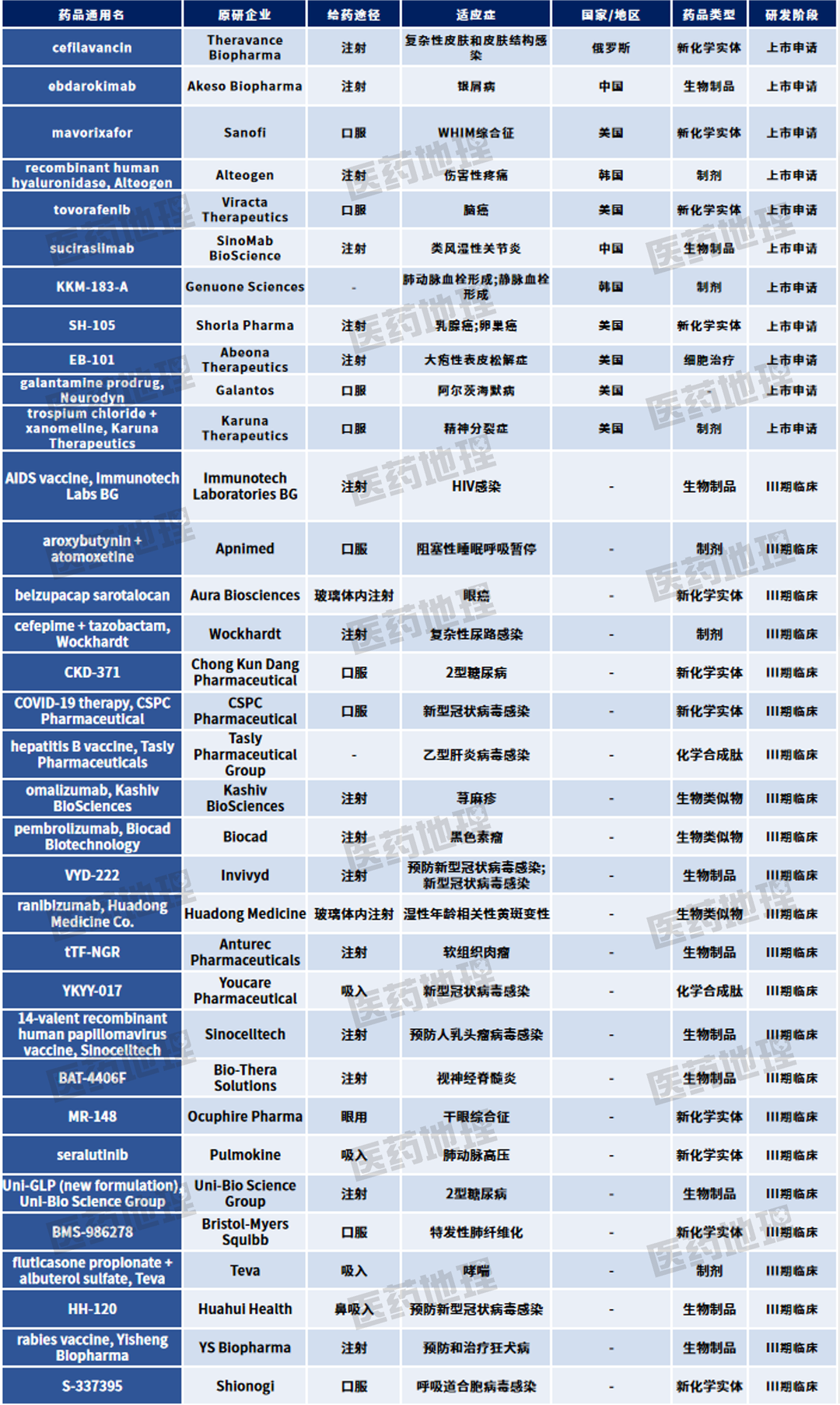 表2:全球提交上市申请新药及全球进入III期临床新药