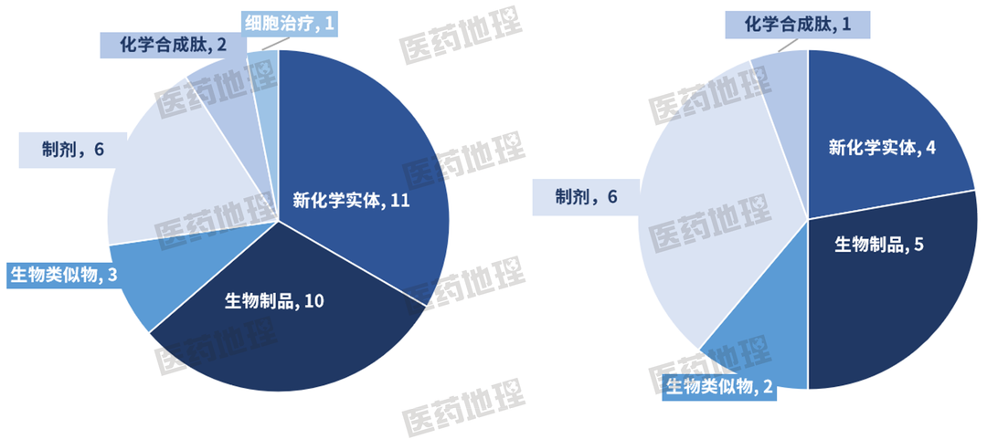针对全球药品研发的概况,据CPM数据库统计,2023年9月份,全球进入注册前阶段的新药有11个,进入III期临床试验阶段的新药有23个。这34款新药中,包含11款新化学实体、10款生物制品、6款制剂、3款生物类似物,2款化学合成肽以及1款细胞治疗药物。