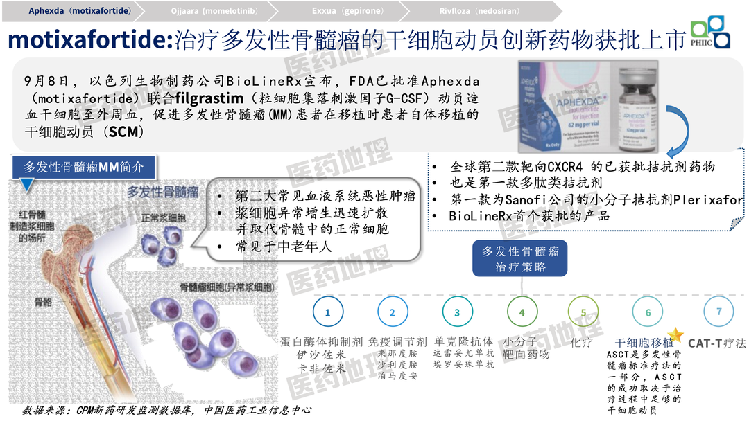 关于多发性骨髓瘤这一适应症,关注我们医药地理的小伙伴可能记得在上个月8月新药事件直播中,我们曾给大家介绍过强生和辉瑞的两款获批治疗复发或难治性多发性髓性瘤患者的双抗,9月,FDA再次批准了一款MM治疗相关的创新药物Aphexda,用以促进移植时患者自体移植的干细胞动员。