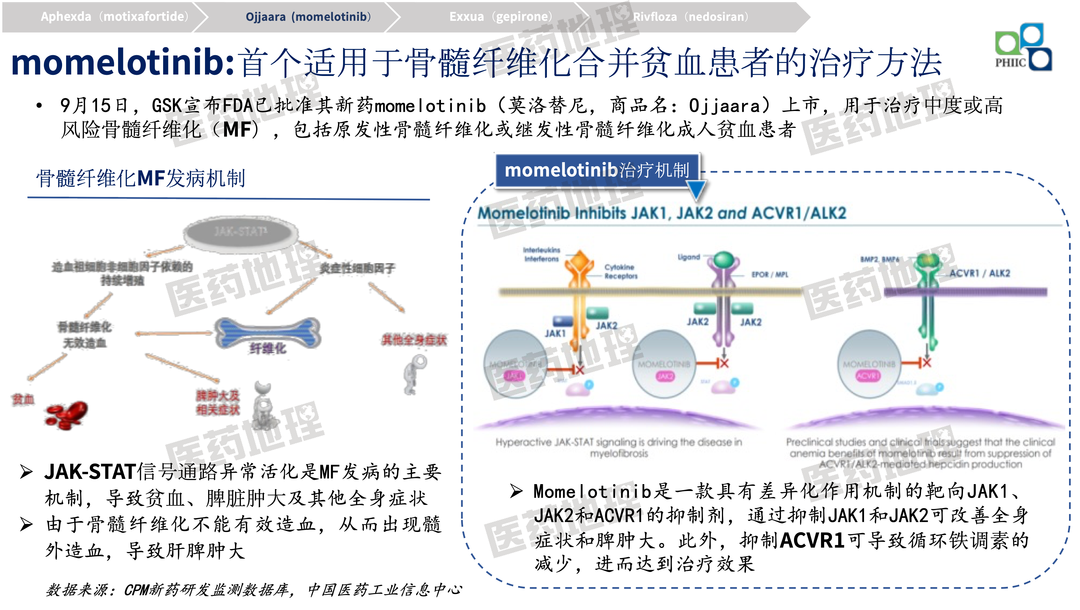 第2个药物是全球首个适用于骨髓纤维化合并贫血患者的治疗药物Ojjaara (momelotinib)。