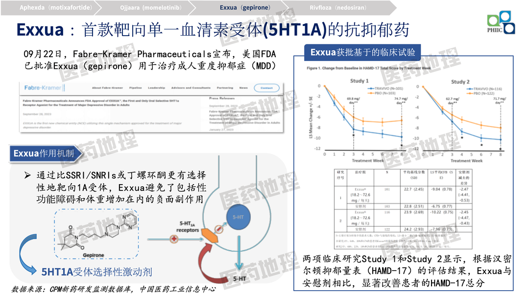 第3个药物是全球首款靶向单一血清素受体(5HT1A)的抗抑郁药Exxua(gepirone)。