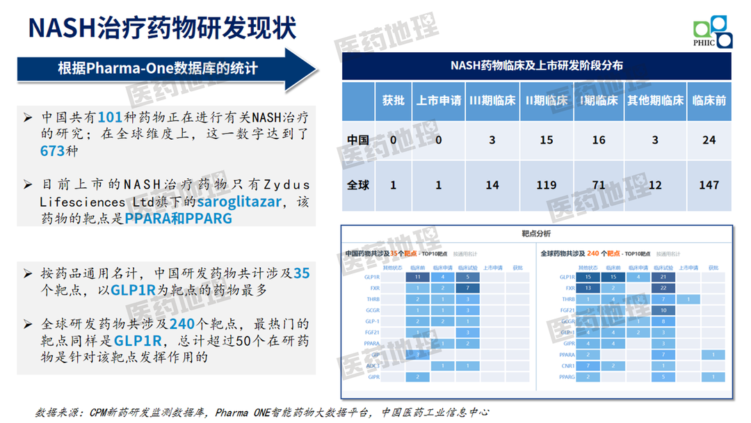根据中国医药工业信息中心Pharma ONE智能大数据平台的统计,中国共有101种药物正在进行有关NASH治疗的研究;在全球维度上,这一数字达到了673种。目前上市的NASH治疗药物只有Zydus Lifesciences Ltd旗下的saroglitazar,该药物的靶点是PPARA和PPARG。