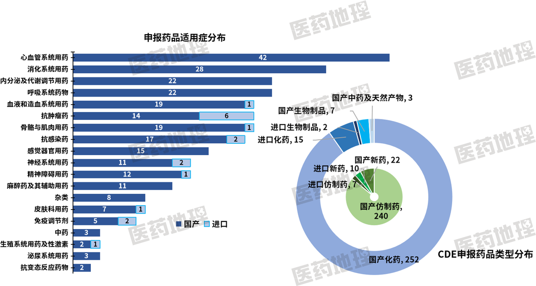 针对国内上市申请药品,据CPM新药研发监测数据库统计,在2023年9月份,按受理号计,国家药品审评中心CDE新受理生产/上市注册申请药品,其中心血管系统用药最多42件,消化系统用药排名第二28件。按照药品国产进口类别统计,国产化药252件,国产生物制品7件,进口化药15件,进口生物制品2件。按照国产进口药品创新程度分类,国产仿制药240件,国产新药22件,进口仿制药7件,进口新药10件。