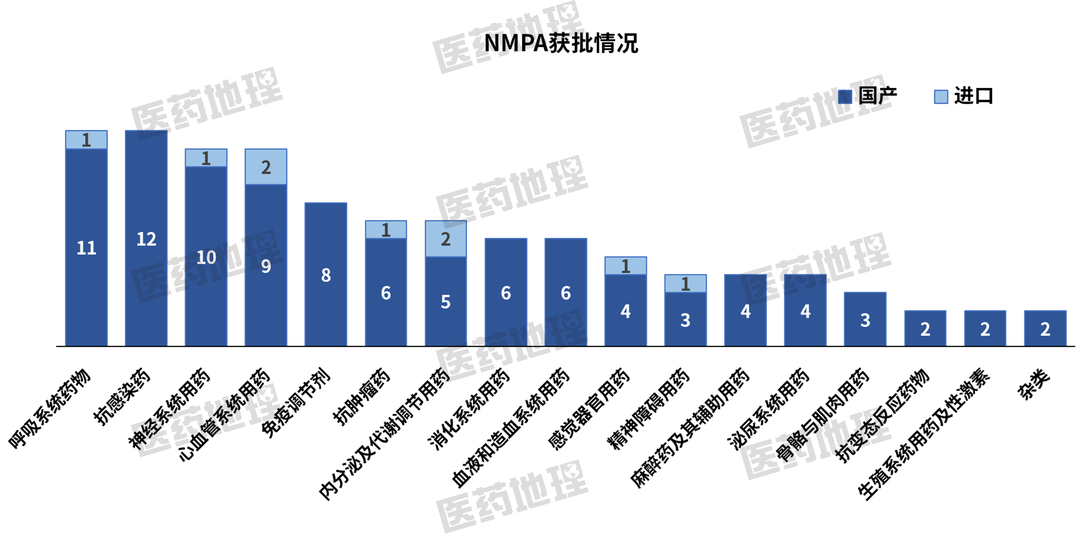 针对药物获批情况,据CPM新药研发监测数据库中的中国上市药品目录板块统计,2023年9月,国家药品监督管理局(NMPA)共批准药品上市申请106件。其中,国产药品97件,涉及17种治疗大类,抗感染药排名第一,有12个已获批上市的药品;进口药品9件,分布在呼吸系统用药、神经系统用药、心血管系统用药、抗肿瘤用药、内分泌及代谢调节用药、感觉器官用药和精神障碍用药。相比于2023年8月份,NMPA获批新药数量有所上升,增加了21件。
