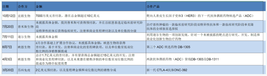 ● 4月和8月,BioNTech与映恩生物达成了两笔交易,获得三款ADC(DB-1303、DB-1311、DB-1305)中国以外的商业化权益,前一笔交易以1.7亿美元及潜在15亿美元里程碑付款包达成,后一笔交易则未披露详情;