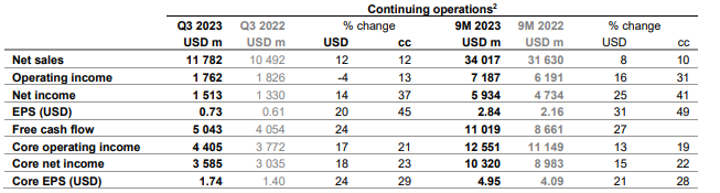 10月24日,诺华官网发布了2023年第三季度季报。据财报显示,第三季度全球净销售额达117.82亿美元,同比增长12%;核心营业收入44亿美元,同比增长21%;前9个月全球净销售额为340.17亿美元,同比增长10%。值得一提的是,第3季度中国区净销售额为8.48亿美元,同比增长14%。