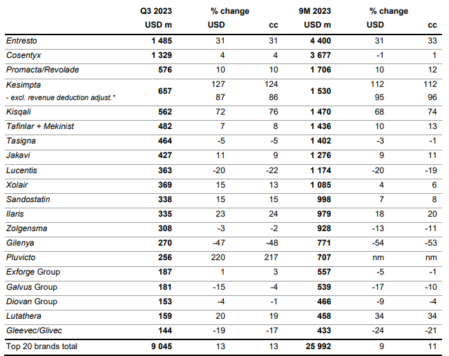 三季度营收增长主要是由CD20抗体Kesimpta(奥法妥木单抗)、Entresto(沙库巴曲缬沙坦钠)、CDK4/6抑制剂Kisqali(瑞波西利)、核药Pluvicto 和Scemblix 等多款当家花旦持续强劲表现贡献。