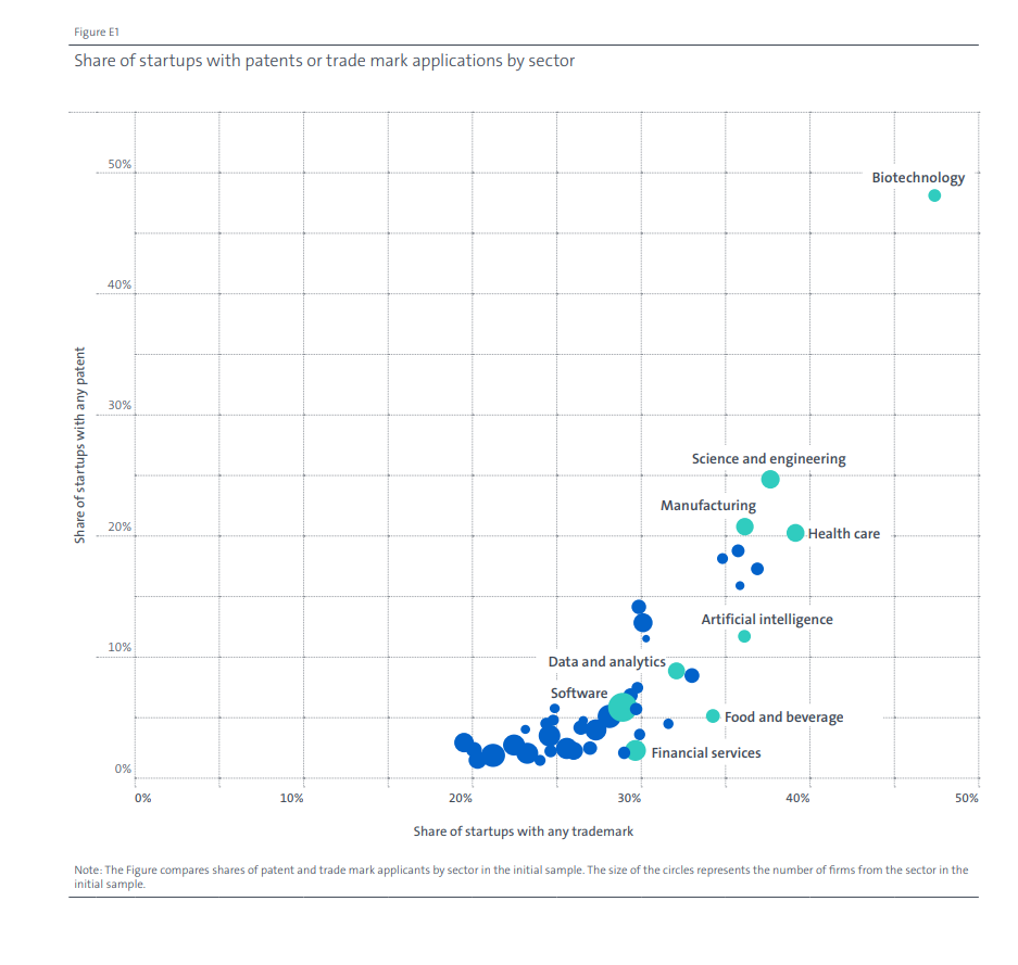 生物技术是知识产权最密集的行业,近一半的初创企业使用专利或注册商标。其他知识产权密集型行业包括科学与工程(专利占比25%,商标占比38%)、医疗保健(专利占比20%,商标占比40%)和制造业(专利占比20%,商标占比36%)。知识产权相对不密集行业对商标的依赖程度更高,而使用专利的初创企业往往更集中在少数与技术相关的行业。