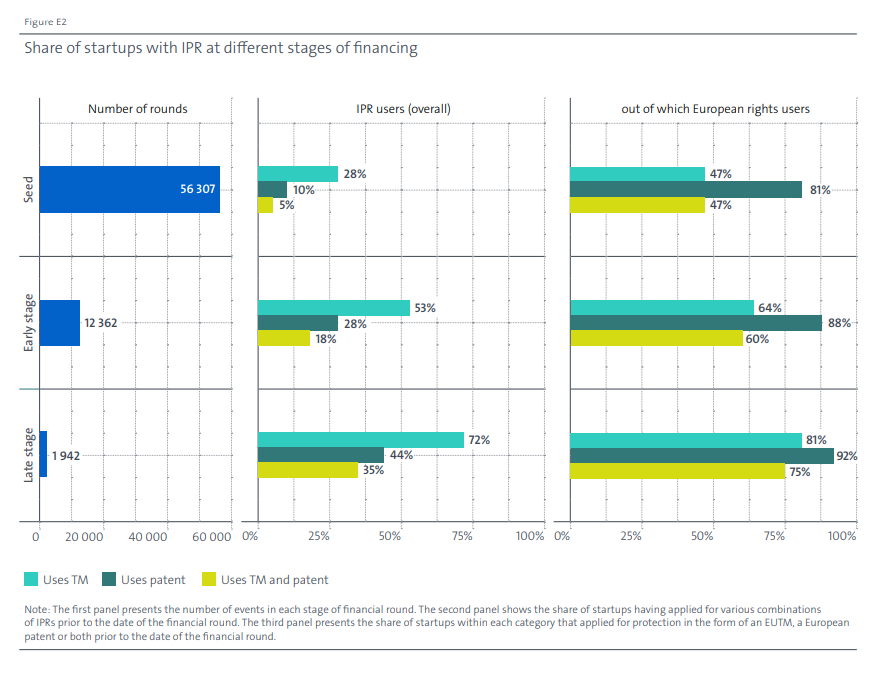 在种子期(Seed)获得风险投资的初创企业中,10%的企业提交了专利申请,在早期阶段(Early Stage),这一比例上升至28%,在后期阶段(Late Stage,C轮及以上),这一比例上升至44%。商标用户的比例从种子期的28%增加至早期阶段的53%、后期阶段的72%。在种子期融资阶段拥有专利的初创企业中,有80%以上提交了欧洲专利申请。在拥有商标的初创企业中,申请欧盟商标的比例从种子期的47%上升至后期阶段的81%。