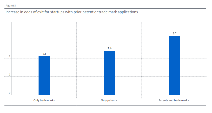 同时申请专利和商标的初创企业首次公开募股或被收购的可能性最高。申请欧洲知识产权的初创企业比只申请本国知识产权的初创企业更有可能实现投资者成功退出。
