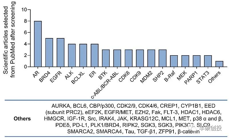 在目前PROTAC临床前研究中,最常见靶点的是AR,其次是BRD4、EGFR和ALK等针对转录调节因子和具有激酶活性的蛋白而设计。