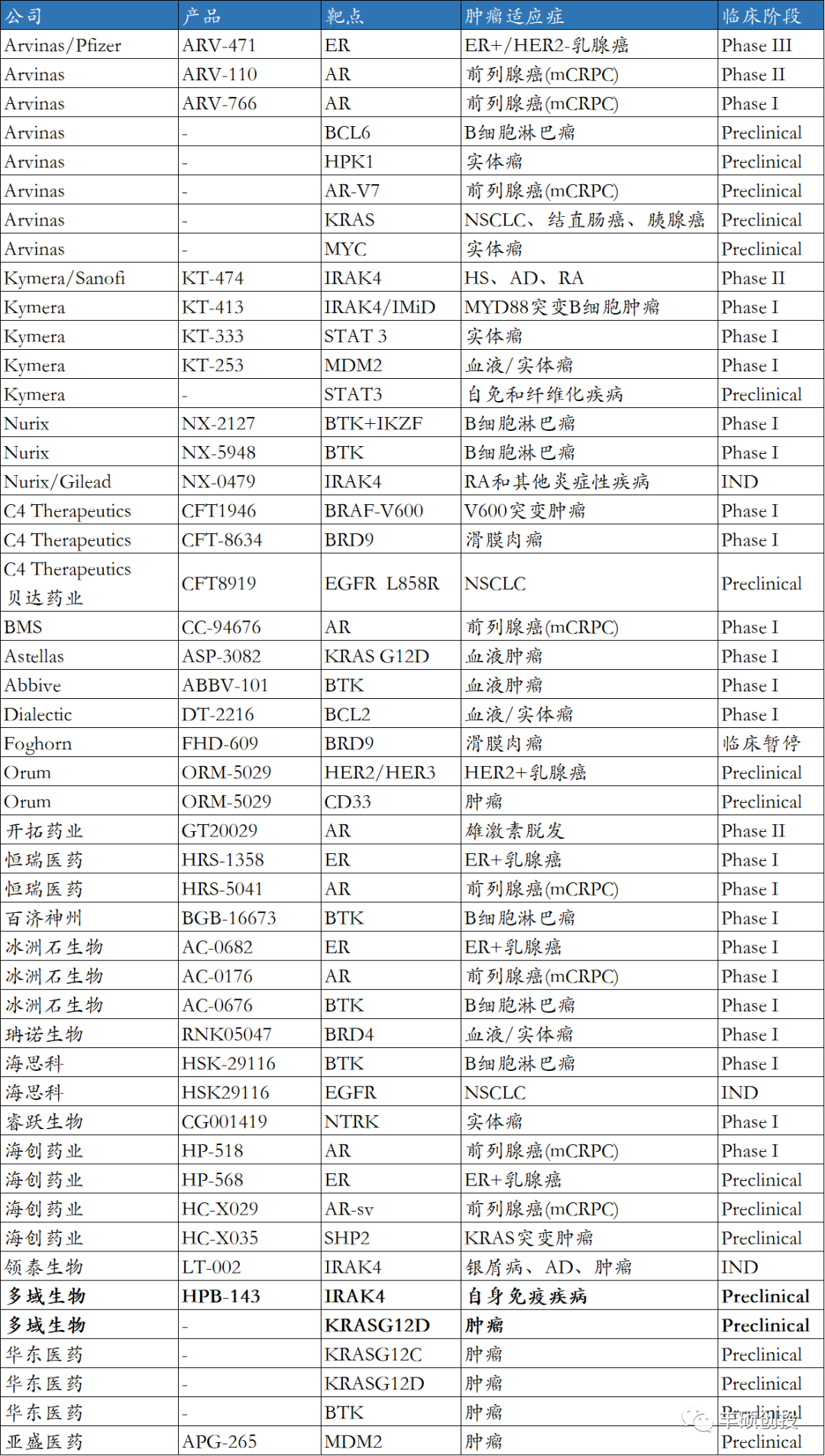 随着近几年国家鼓励创新研发,国内专注蛋白靶向降解这一新技术领域的初创公司也逐渐显现,其中有不少是前国际医药巨头的相关研发负责人归国创立的,例如冰洲石医药、珃诺生物、多域生物、星亢原生物、奥瑞药业等;此外,这一赛道也吸引了国内规模药企的关注,包括恒瑞医药、华东医药、石药集团、百济神州、诺诚健华、海思科、海创药业也相继入局。