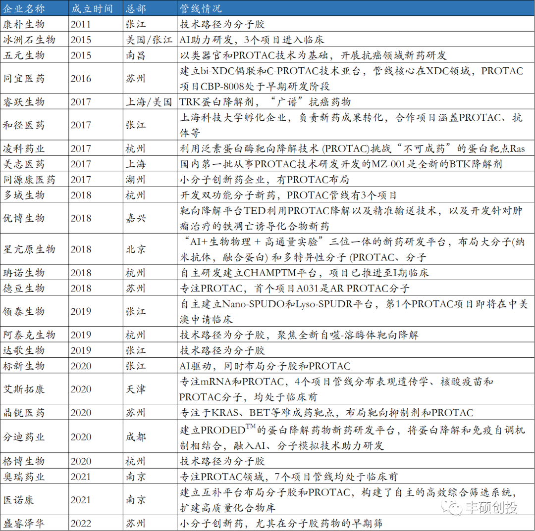 图8 国内蛋白降解领域初创企业名单(来源:张江药谷、公开信息,丰硕创投整理)