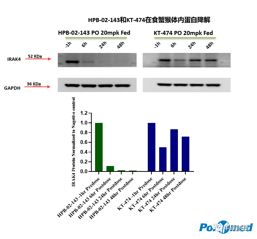 多域IRAK4 PROTAC分子(HPB-143)在临床前研究中展示出治疗潜力临床应用前景,拥有的出色蛋白降解效果和激酶选择性,良好的药代动力学特征,以及动物模型中明确的药效与可控的安全性。HPB-143具有“同类最佳”开发潜力:1) HPB-143对比KT-474(Kymera)拥有更强的蛋白降解效果,2)HPB-143拥有49%的口服生物利用度,为同靶点候选项目中最佳;3) HPB-143具有潜在人体更优的安全性。根据Kymera公布的临床数据,KT474显示对人体心脏QT信号延长的副作用,这个副作用与体外hERG抑制活性相关。HPB-143对hERG没有抑制(IC50>10μM),而KT474对hERG有一定的抑制活性(IC50为0.36μM)。4)在平行比较的多个动物药效实验中,HPB-143比KT474有更低的起效剂量。